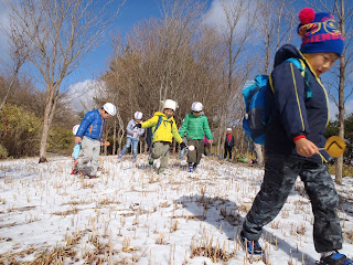 雪解けの水が木の上から「ぽつん、ぽつん」と音をたてて落ちてきます。つるつる滑る斜面を子どもたちは両手と両足を上手に使って登っていきます。「がんばれ!」とグループのお友だちを励ます声があがりました。